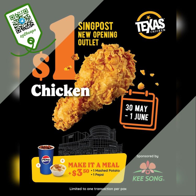 SingPost Centre, get ready for some Texas Chicken goodness! We’re celebrating our new opening with a limited time only $1 Chicken deal happening for 3 days only from 30 May to 1 June 2025!