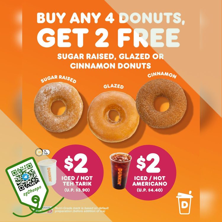Buy any 4 donuts and get 2 free sugar raised, glazed or cinnamon donuts! Plus, sip on joy with $2 Teh Tarik and Americanos – hot or iced!